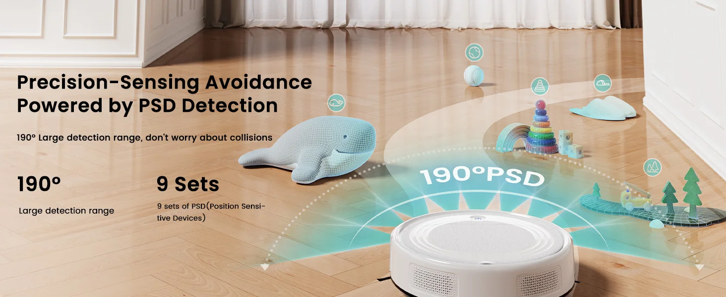 - Navegación ToF con sensor PSD 190° - Mapeo inteligente que evita obstáculos con precisión milimétrica